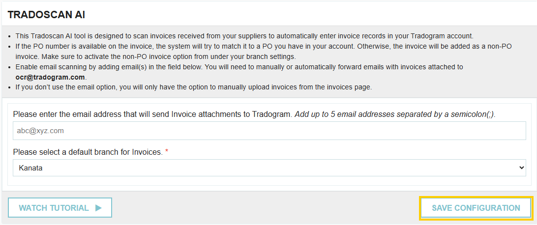 This method automatically routes all invoices received via a dedicated email address into TradoScan AI for processing.