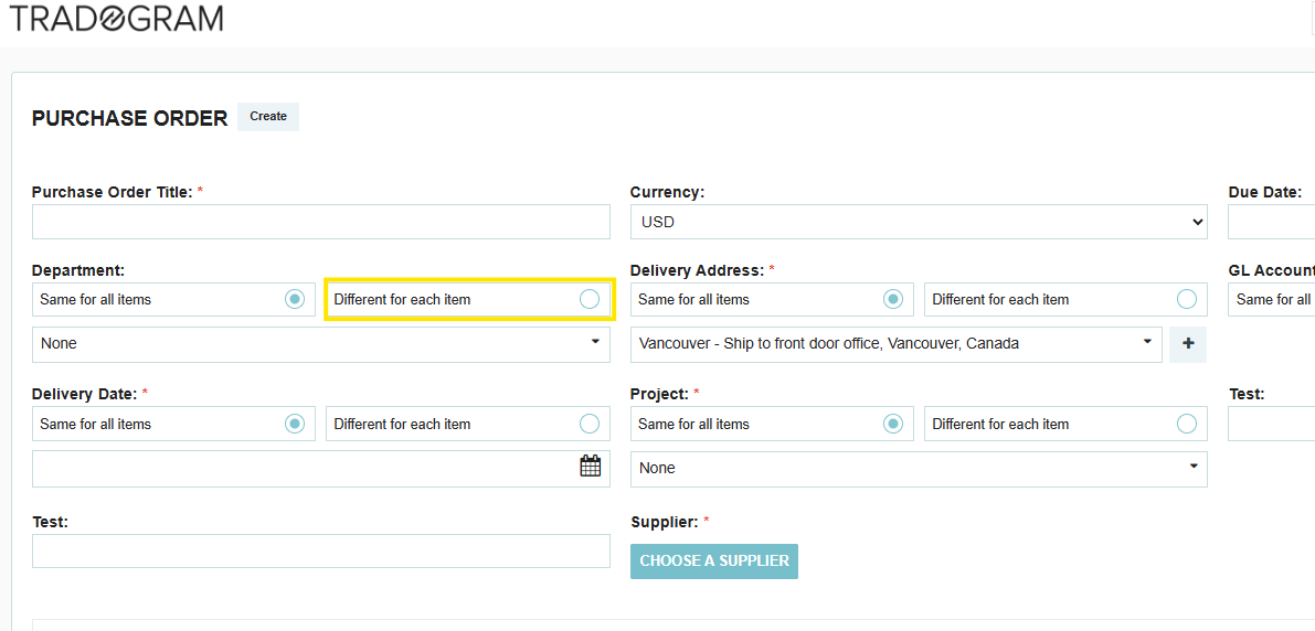 2. When entering the details on the transaction, under department, select “Different for each item”