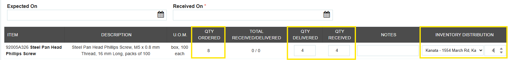 1. First Delivery Record: Create a new delivery record for the first portion of the shipment. Receive a quantity of 4, and in the inventory distribution section, assign these 4 boxes to Location A.