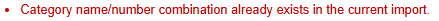This means that you have two identical rows in your import file. Specifically, there is another line with the exact same values for the Name and Parent Category fields. Review your import file and ensure every category entry is unique.