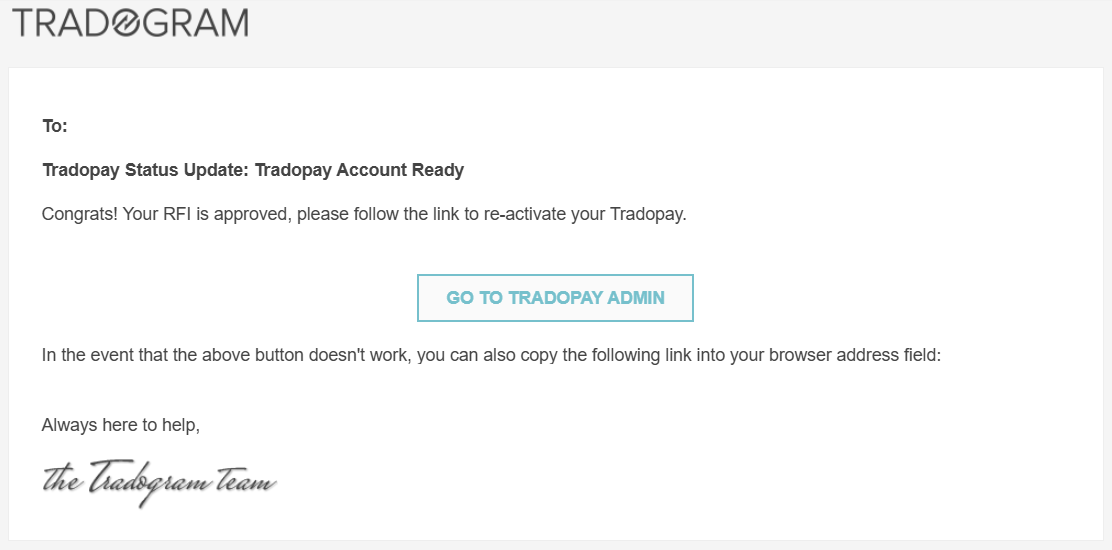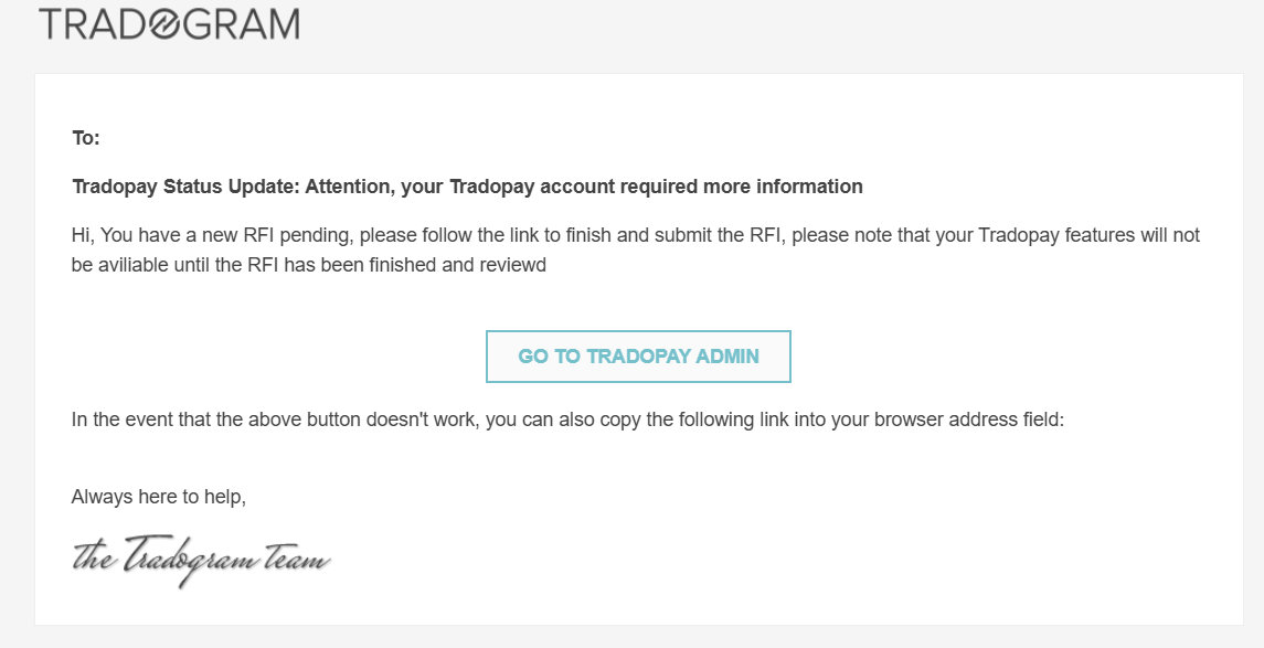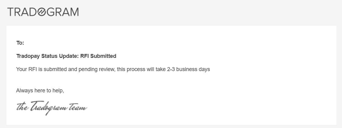 When registering for TradoPay, some users may be required to provide additional verification to finalize their application. This process ensures compliance and security for your business transactions. If your account is flagged for further review, the account's main admin will receive a Request for Information (RFI) via email.