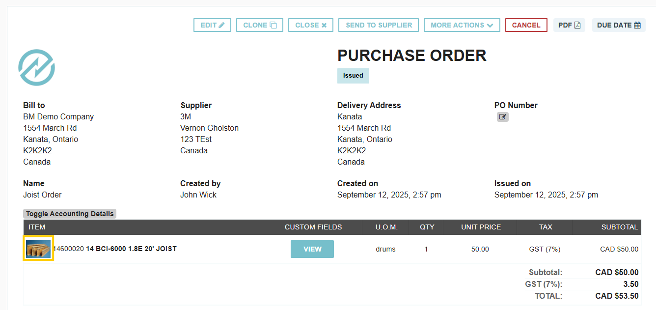 The image is included on both the electronic version of the purchase order and the PDF version that is sent to you and the vendor.