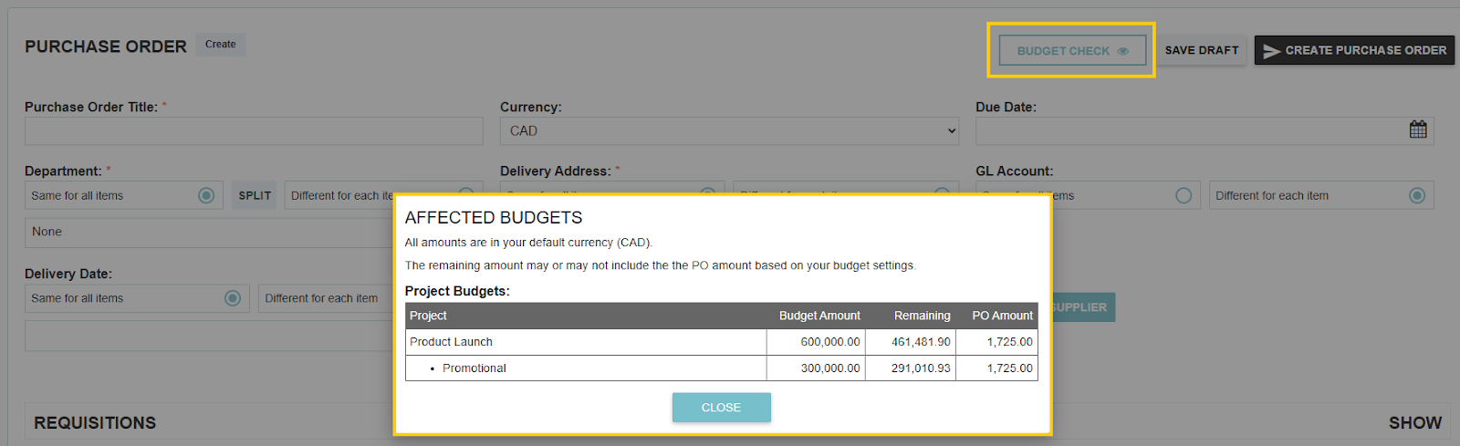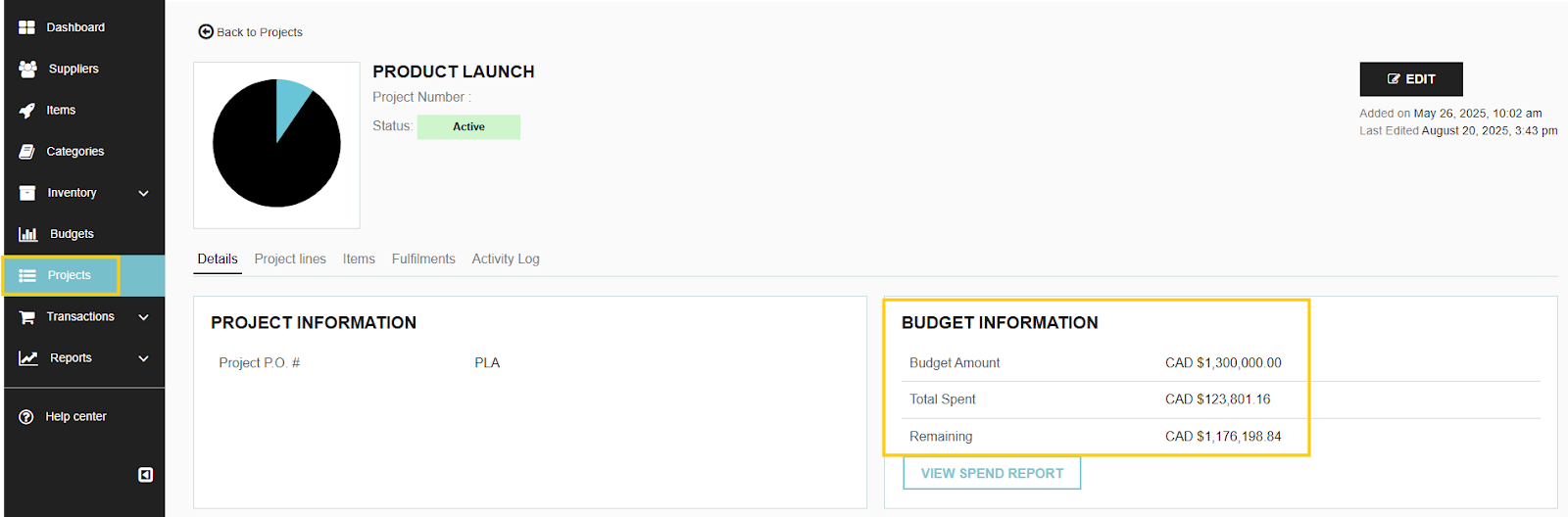 Project budgets are tracked by linking the cost of items from a transaction to a specific project. When a transaction is created, users can choose to allocate the cost of the entire transaction, individual line items, or even split the value of the transaction by percentage allotted to a project.
