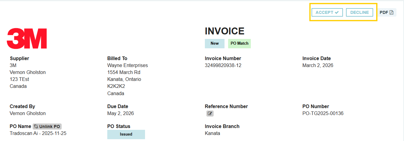 When a supplier invoice is marked as Declined in Tradogram, the action is final to ensure a clear audit trail. Because a rejection effectively "closes" that specific digital submission, the status cannot be toggled back to "Pending" or "Approved" by the user.