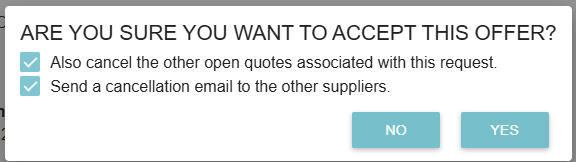 2 When you accept an offer on a request with multiple suppliers, users can choose to cancel the other open quotes associated with the request and choose to send a cancellation email to the other suppliers. Offers can be cancelled at any point, regardless of whether there are any bids. See the image below.