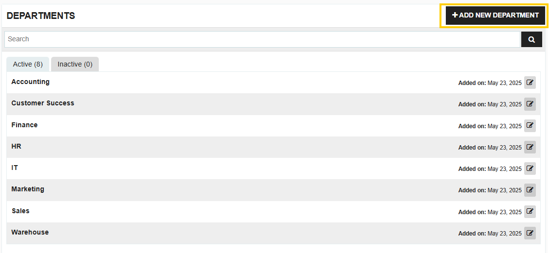 Departments are broad functional units (e.g., Sales, HR, Finance) within your company that allow for additional structural and financial control beyond the branch level. They are essential for segmenting business functions that may generate revenue or incur specific costs.