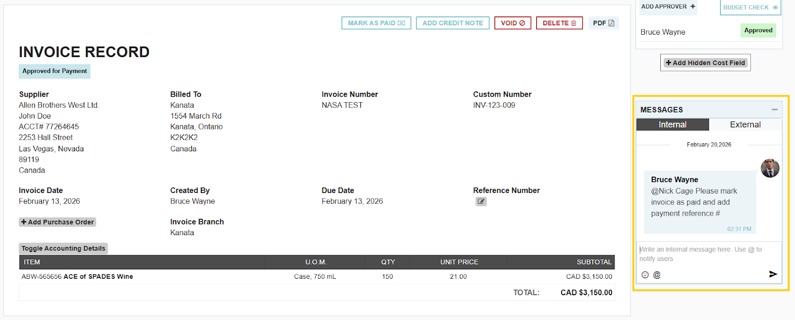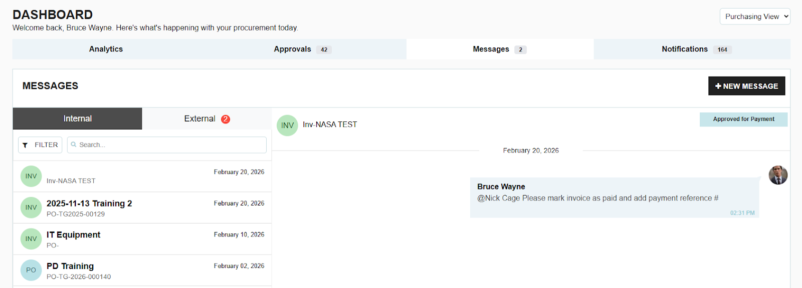 One of the most powerful ways to use the messaging tool is directly within a specific transaction (such as a Requisition, PO, or Expense). By using the message button at the top right of a transaction screen, you can start a conversation that is permanently linked to that document.