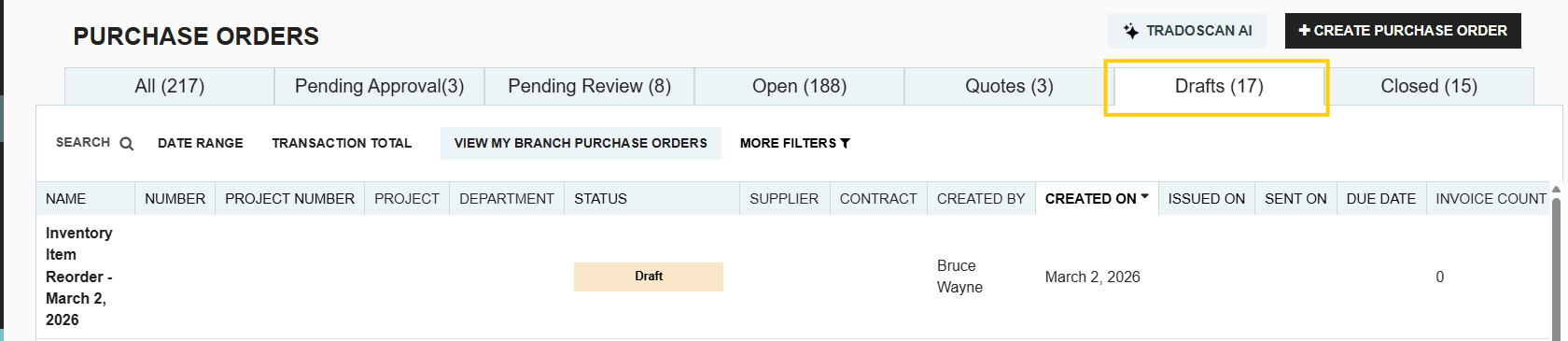 Pro Tip: Drafts do not trigger any notifications to managers or vendors. This makes the "Draft" state a "safe zone" to build, edit, and perfect your documents before they become official records.