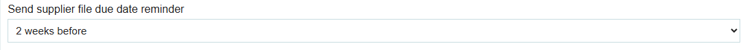 At the bottom of the list of settings, you will see Send Supplier file due date reminder. This can be set to: 1 day, 3 days, 1 week, 2 weeks, or 1 month before the due date. The supplier due date reminder will be sent to the user who set the due date.