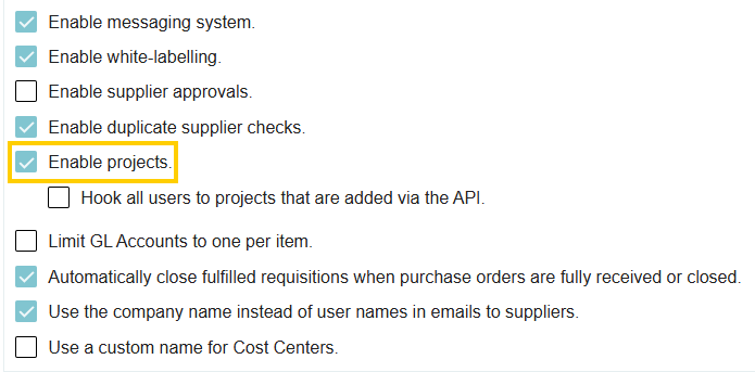 Because Projects is an optional module, it must first be activated at the company level by an administrator:
